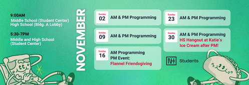 6th-12th grade students are invited to join us on Sunday night in the Student Center. You can expect worship, games, and community with other students. Student small groups also meet on Sunday nights and are grade/gender divided (ie: Middle School Girls).
